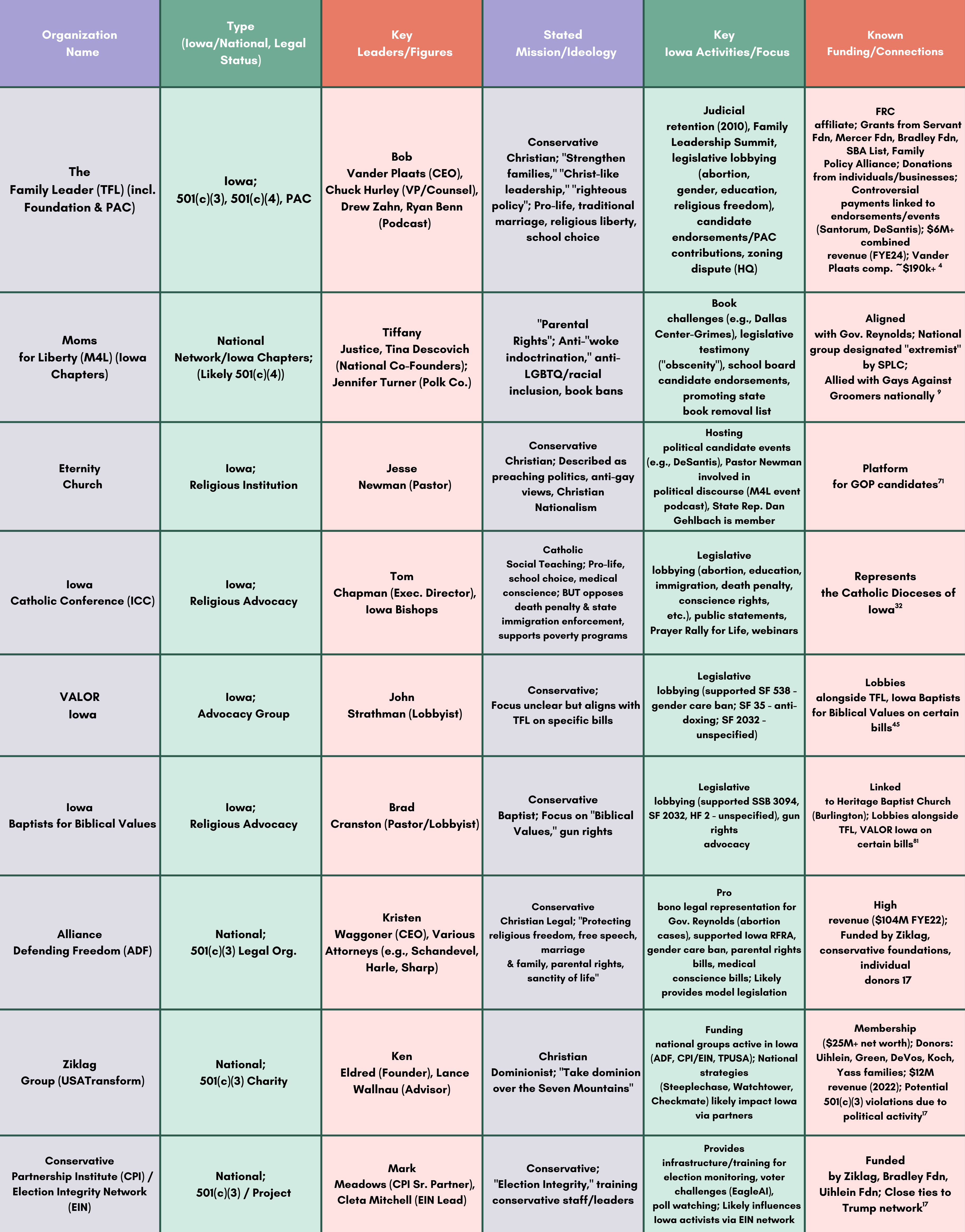 Insider Lobbying & Access: Using established relationships (TFL, ADF), coordinated messaging, and employing lobbyists, including former state legislators like Chuck Hurley and Danny Carroll78, grants crucial insider access to push specific bills like SF 418 and DEI bans. Often coordinating efforts with additional allied groups like VALOR Iowa and IBBV79. Gov. Reynolds' praise for TFL exemplifies this access80.